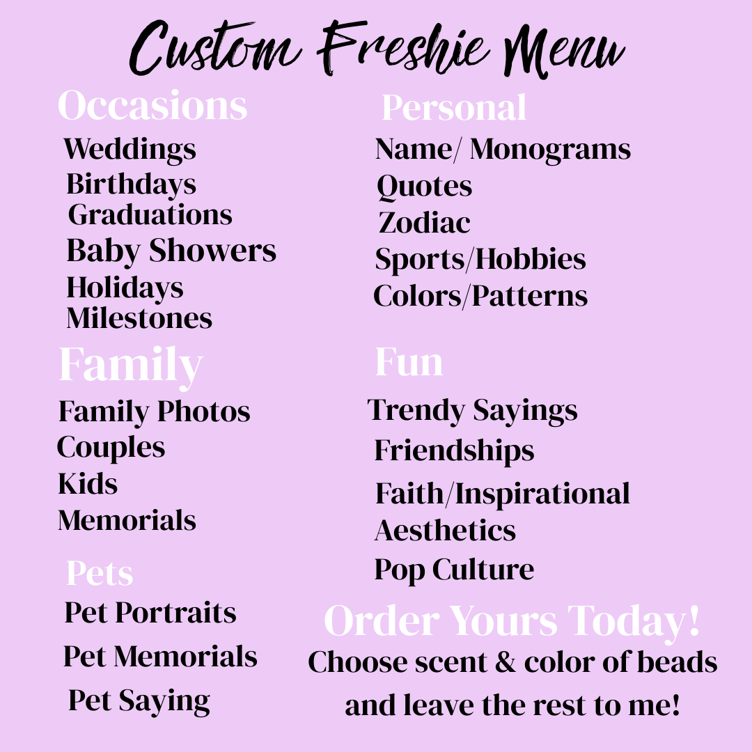 Bring your car freshener to life with Custom Freshie Rounds! Just send your favorite photo to sweettsboutique2@yahoo.com, pick your scent and bead color, and watch your unique creation come together. It’s a playful way to keep your ride smelling great and feeling personal! Leave your scent and bead color of choice in the notes before checkout.